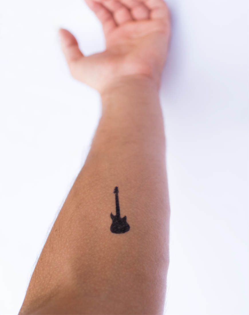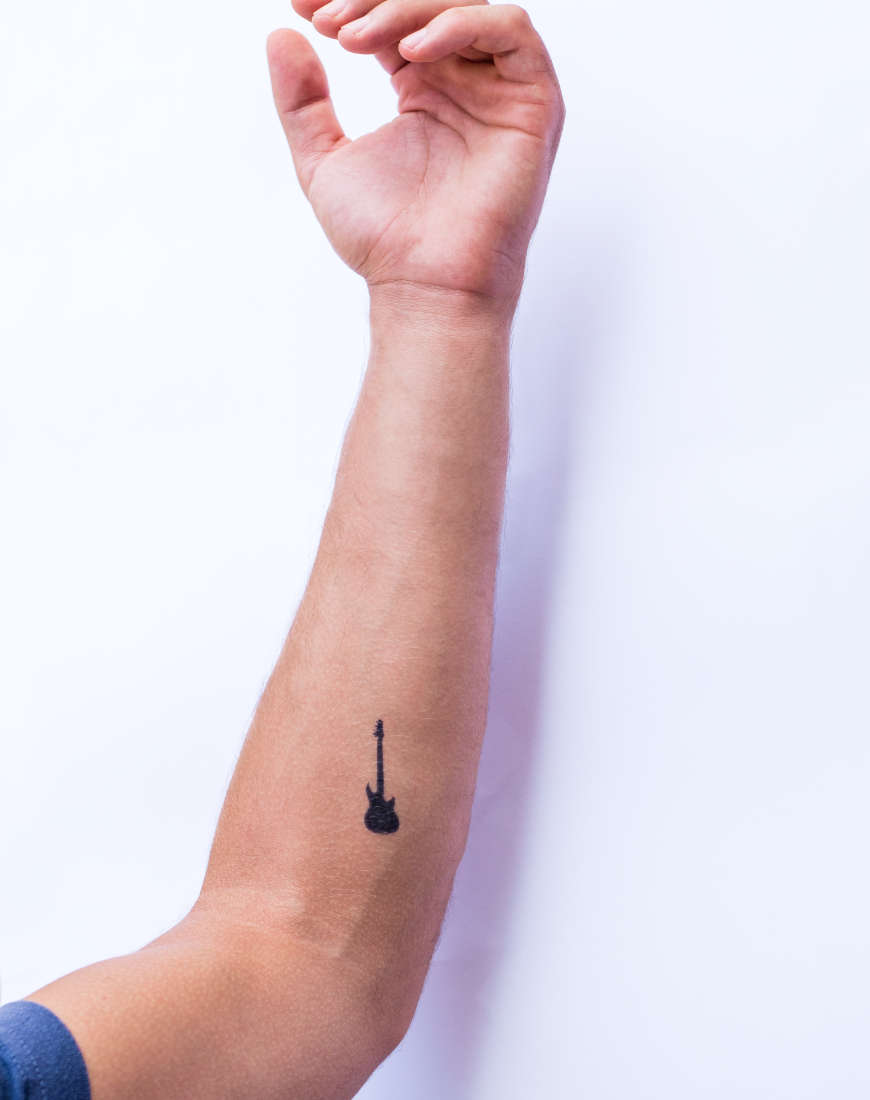 Tatuaje para los amantes de la música. Jimmy Page, Eric Clapton, Keith Richards… y otros muchos son los grandes músicos que durante años han estado a la cabeza del rock and roll con la guitarra eléctrica como instrumento más representativo, que es sin duda el corazón de este tipo de música.